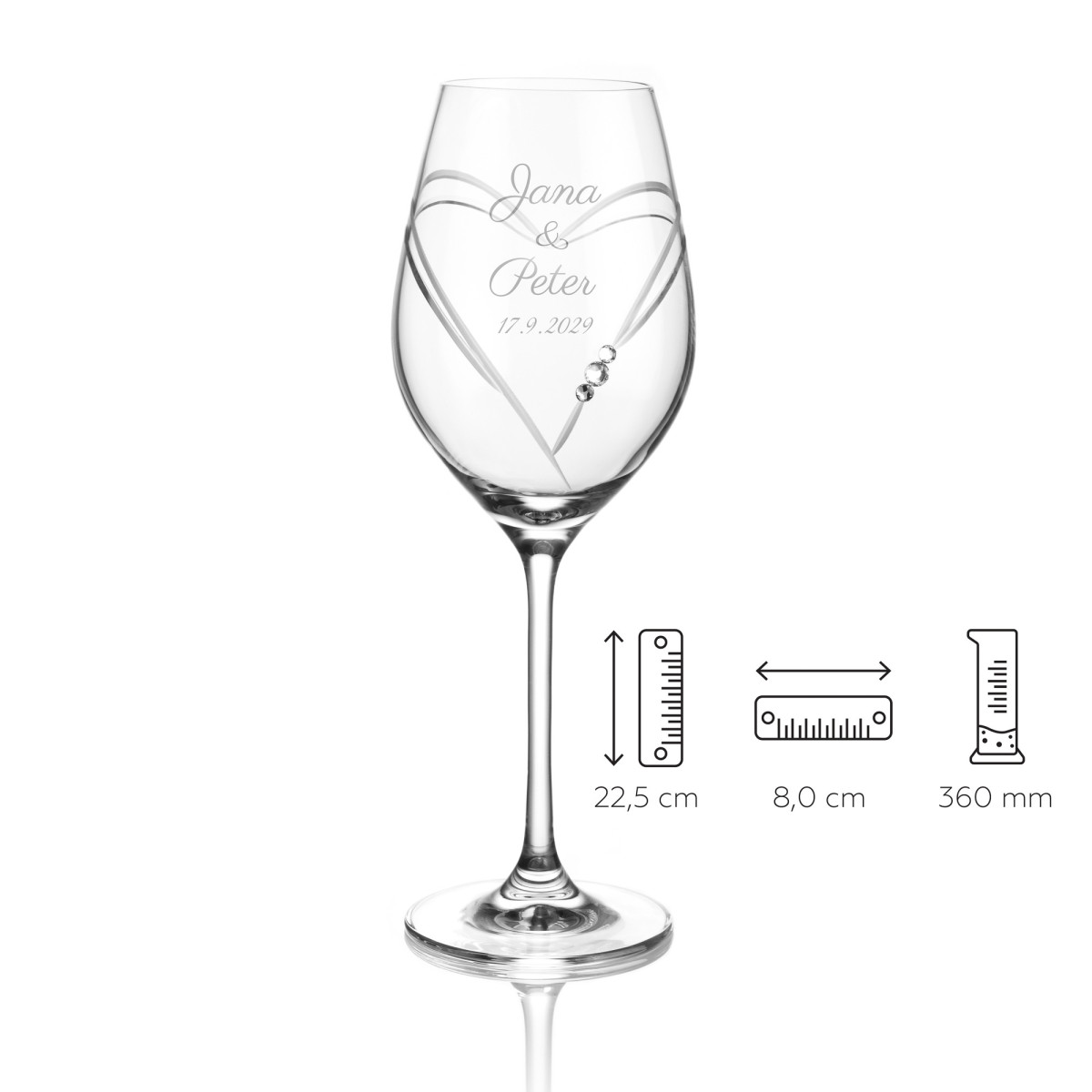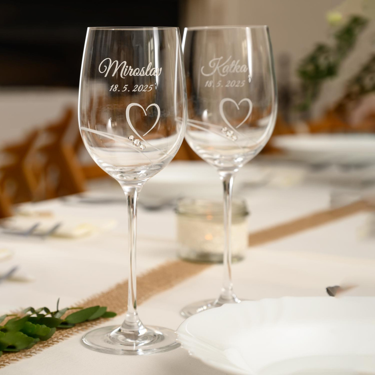 Svatební sklenice Romance na bílé víno – srdce, Swarovski, gravírování pro...