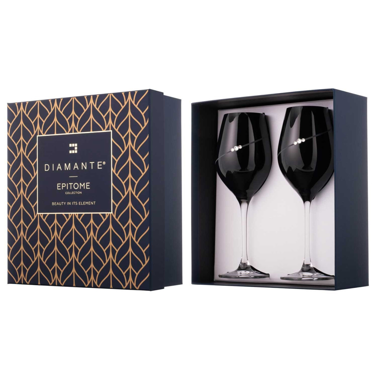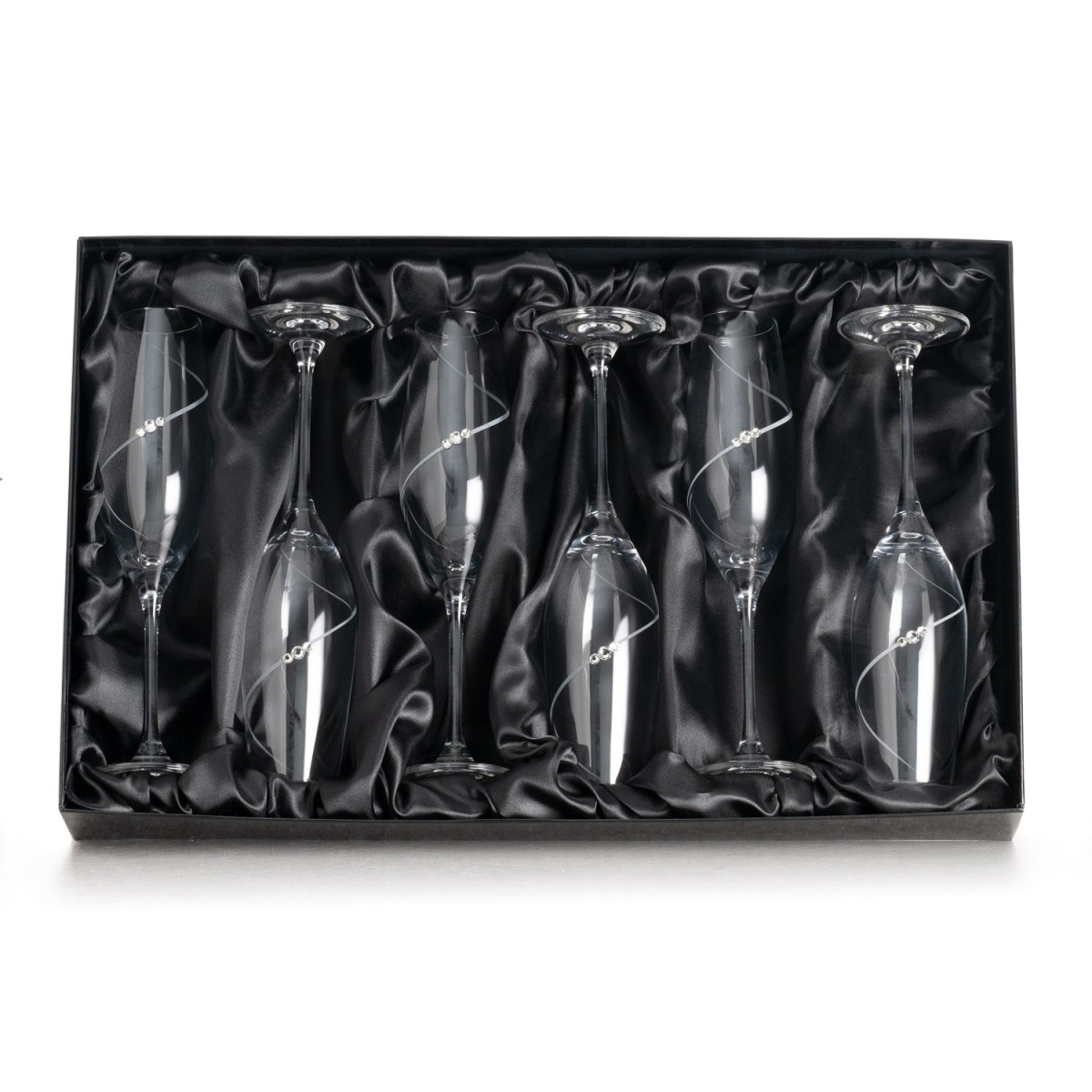 Dva úzke poháre na všetky druhy šumivých vín ako je šampanské, prosecco, alebo cava. Každý pohár má obsah 210ml a je zdobený s matnou špirálou a Swarovski® kamienkami. Čierna farba je určená pre potravinárske účely a je samozrejme umývateľná - poháre môžete bez problémov použivať ako klasické číre poháre.
